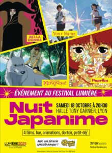 Une autre séance événement avec la nuit japanime toujours à la Halle Tony Garnier, le samedi 18 octobre de 20h30 à l’aube. 4 incontournables de l’animation japonaise y seront présentés : Princesse Mononoké de Hayao Miyazaki (1997), Your Name de Makoto Shinkai (2016), Belladonna de Eiichi Yamamoto (1973) et Paprika de Satoshi Kon (2006) (1). À voir ou revoir pour se rendre compte de l’absolue diversité du genre et de l’inventivité de ses auteurs ! D’autant qu’une librairie manga sera présente lors de cette nuit animée.