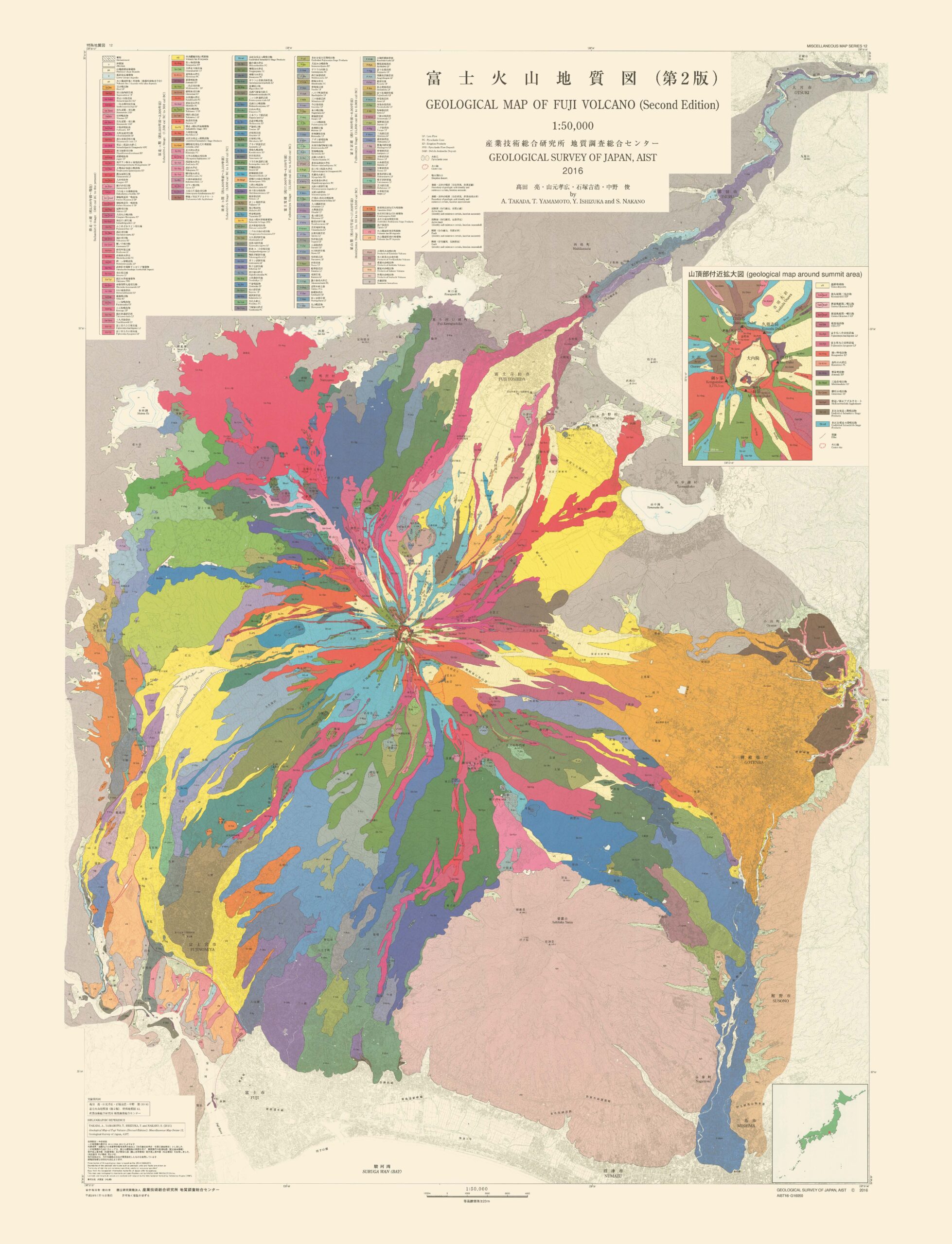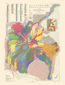 Les cartes, quant à elles, fourmillent de détails et de couleurs comme cette carte géologique du Mont Fuji, stratovolcan qui s’épanouit comme une fleur multicolore !
