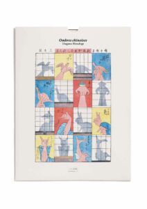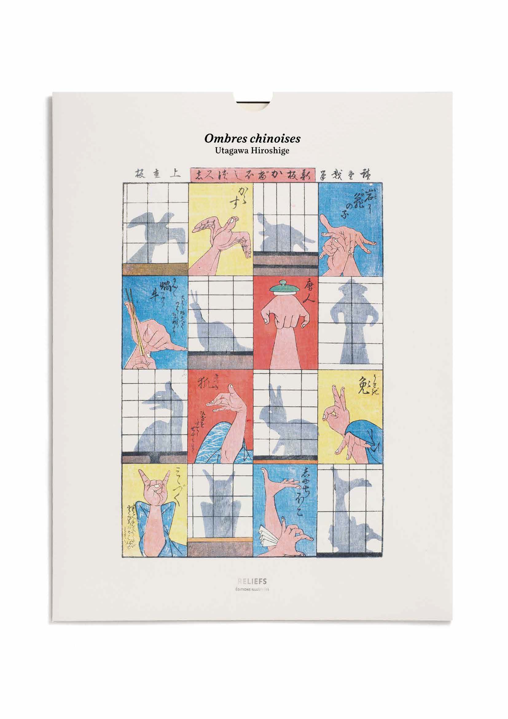 On retrouve aussi l’esprit d’enfance dans l’édition illustrée Ombres chinoises. Ce sont huit ombres avec les mains publiées autour de 1842 par le grand éditeur Jōshūya Jūzō (1812-1876). Elles font partie d’une série de planches d’omocha-e : estampes de jouets, destinées aux petits Japonais amateurs du théâtre d’ombres, originaire de la Chine mais aussi de l’Inde.