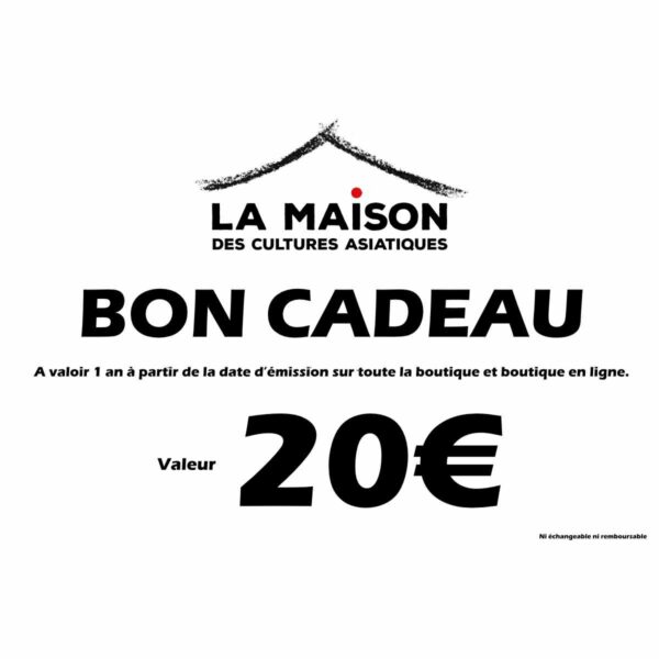 La Carte cadeau est valable 1 an à compter de sa date d’achat sur la boutique en ligne ou à la maison des cultures asiatiques