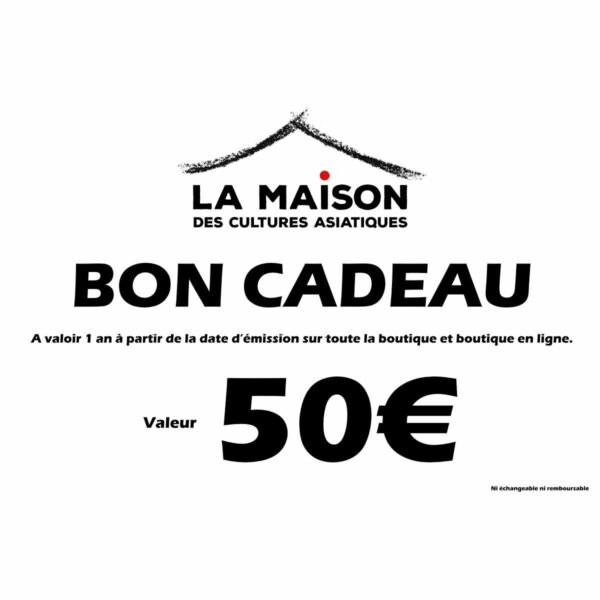 La Carte cadeau est valable 1 an à compter de sa date d’achat sur la boutique en ligne ou à la maison des cultures asiatiques